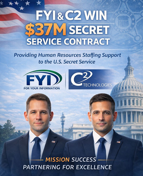 FYI, with C2 Technologies as a major teaming partner, has been awarded a $37 million contract to provide human capital support services to the U.S. Secret Service. The work includes consulting, staffing, classification, training, and related support services. With more than three decades of experience serving public and private sector clients, the team is proud to support this important mission with agile, high-quality workforce solutions.
